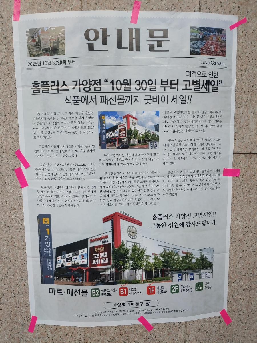 서울 강서구의 랜드마크이자 오랜 세월 동안 지역민의 생활 중심지로 자리했던 홈플러스 가양점이 오는 **2025년 10월 30일(목)**을 끝으로 문을 닫습니다.